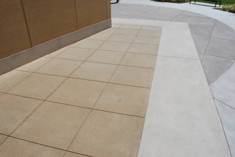 concrete paving types with varying colors and textures, cast concrete retaining walls, and
