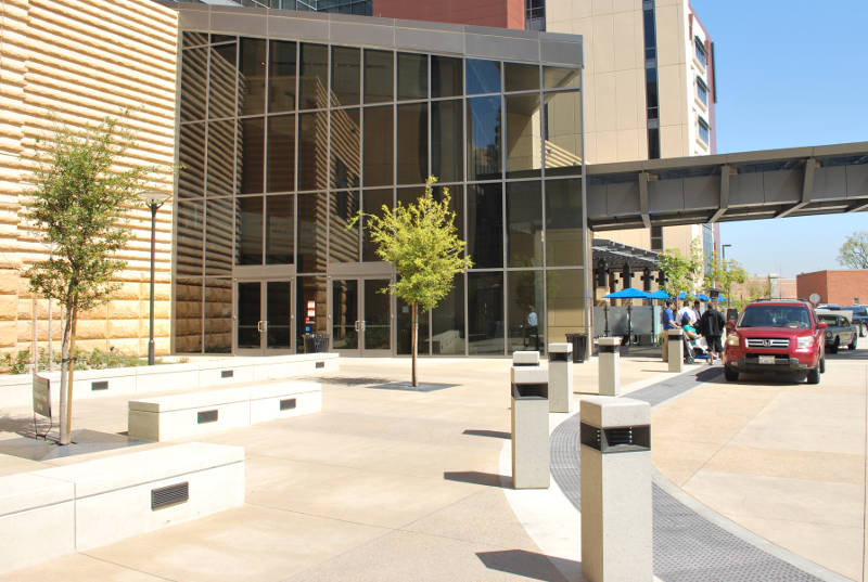 site to create a large public square. This space combines landscape and hardscape amenities,